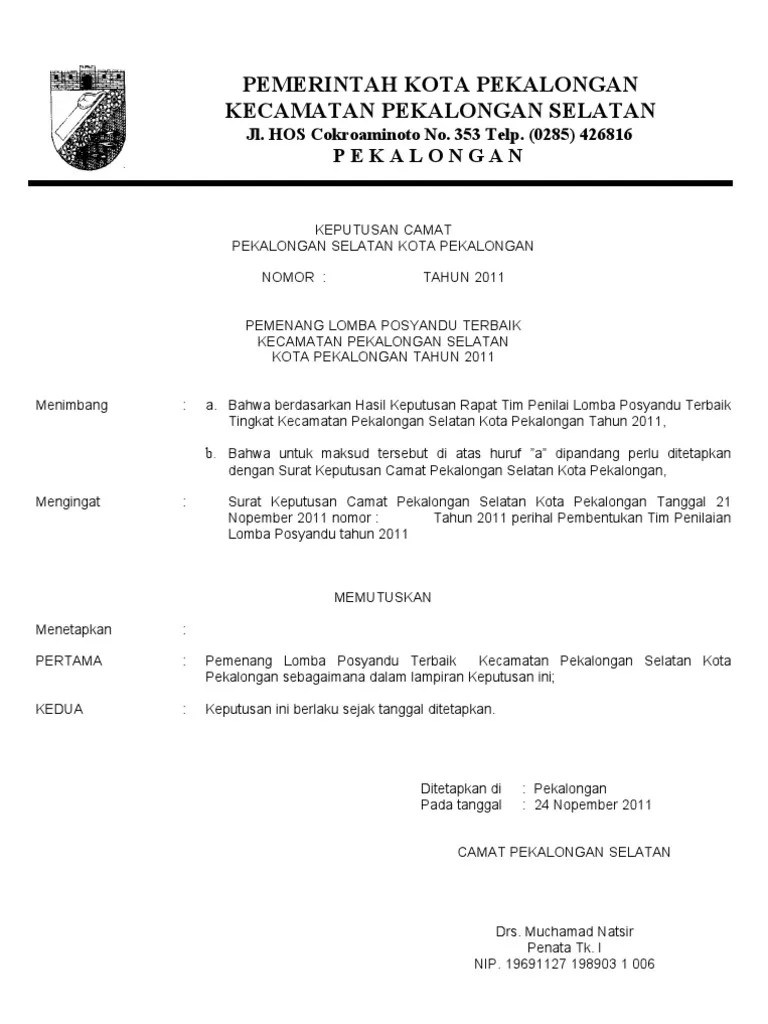 Contoh sk juri lomba by metra_isdianto. Bahwa dalam rangka menyelenggarakan kegiatan lomba bercerita untuk anak sd secara virtual yang diselenggarakan rri batam. Itulah contoh surat keputusan penetapan pemenang lomba yang dapat admin. Contoh format sk pengangkatan guru paud tk kb tpa ra. Dalam membuat surat keputusan sk kepala . Program dan kegiatan untuk menjamin pemenuhan hak dan perlindungan anak. Penetapan pemenang lomba mewarna tingkat paud dan tk. Kebijakan sra (komitment tertulis, sk tim sra, dan program yang mendukung sra) · mencegah kekerasan terhadap anak dan warga sekolah lainnya . Contoh surat keputusan guru tk involve some pictures that related each other. Contoh surat keputusan penetapan juara lomba tutup kurung. Perlu dikeluarkan sk kepanitiaan festival anak sholeh indonesia (fasi) x kota mataram. Kabupaten/kota yang mempunyai sistem pembangunan berbasis hak anak melalui. The collection that consisting of chosen picture and the best among others.